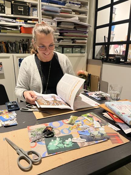 Collage: Vi har en stor reol fyldt med bøger og ugeblade, lige til at klippe i. Du kan derfor også lave collage i forskellige størrelser og vi sælger også færdiglavede "collage-kits" lige til at gå til.